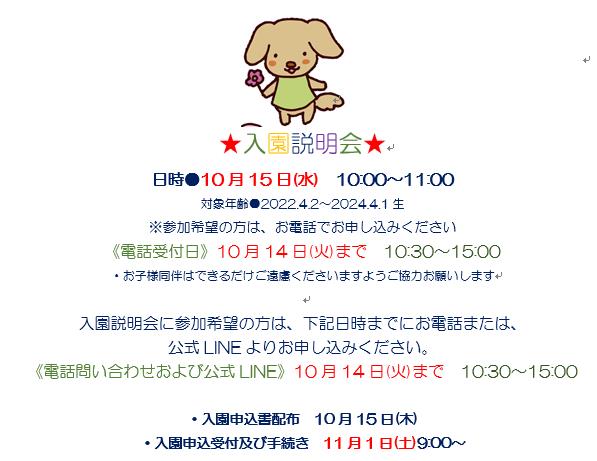 入園説明会に参加希望の方は、下記日時までにお電話または、